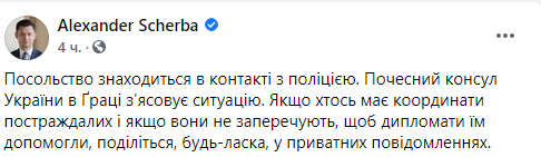 "Почетный консул Украины в Граце выясняет ситуацию. Если кто-то знает координаты пострадавших и если они не возражают, чтобы дипломаты им помогли, поделитесь, пожалуйста, в личных сообщениях", - написал Щерба.