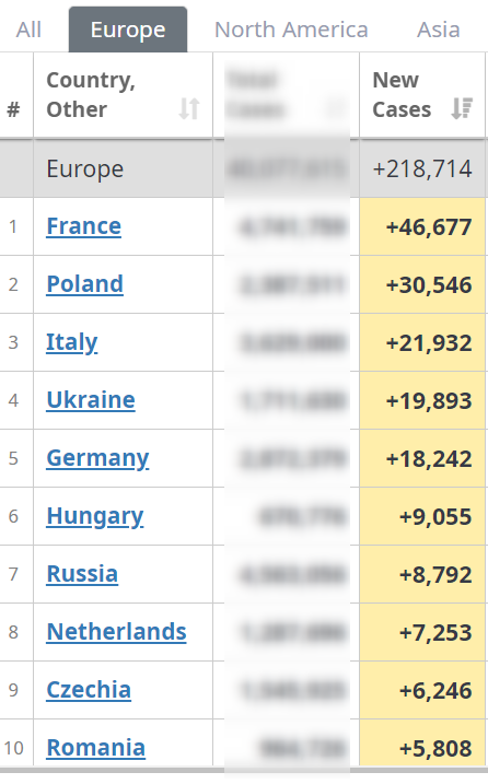 С таким показателем Украина вчера вошла в пятерку антилидеров Европы по приросту ковида. Обгоняют нас пока только Франция, Польша и Италия.