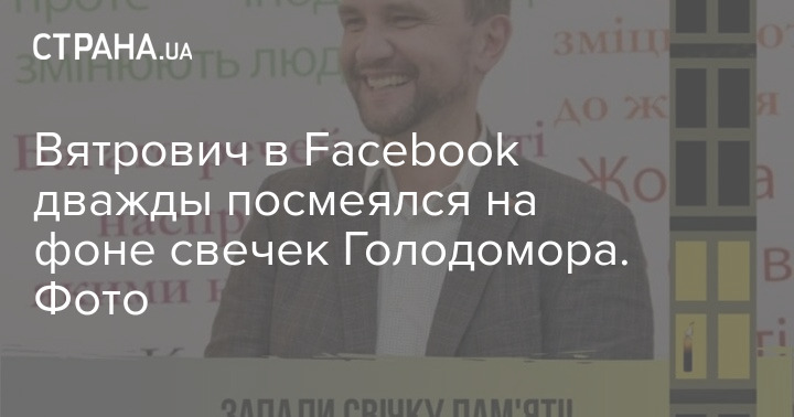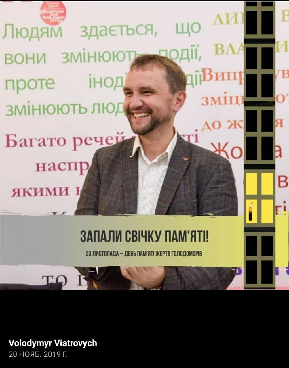 Так, пользователи обратили внимание, что на одном из фото Вятрович смеется рядом призывом зажечь свечу памяти в честь жертв Голодомора. Такую рамку Вятрович сделал как раз в памятные дни в ноябре 2019 года.