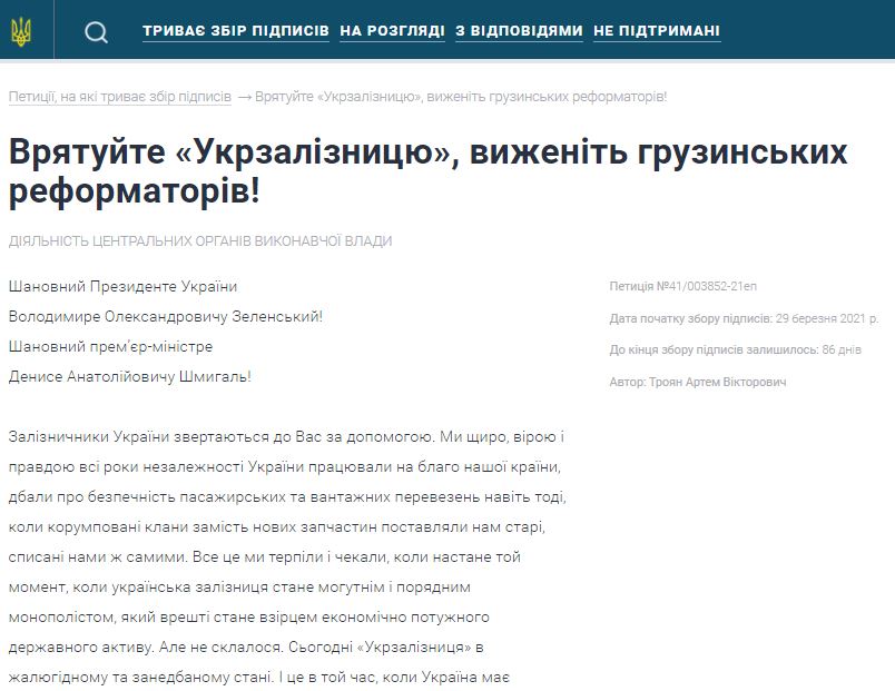 За несколько дней до назначения Полины Лысенко-Чиж на должность главы центра по борьбе с фейками на сайте Кабмина появилась петиция "Спасите "Укрзализныцю", выгоните грузинских реформаторов". Ее автор обвинил Полину Чиж, которая пришла в компанию, в том, что ее должность формальная, а главная функция – передавать информацию по УЗ, в том числе ту, которая содержит коммерческую тайну, Гизо Углаве и приставленному ним детективу Денису Гюльмагомедову.