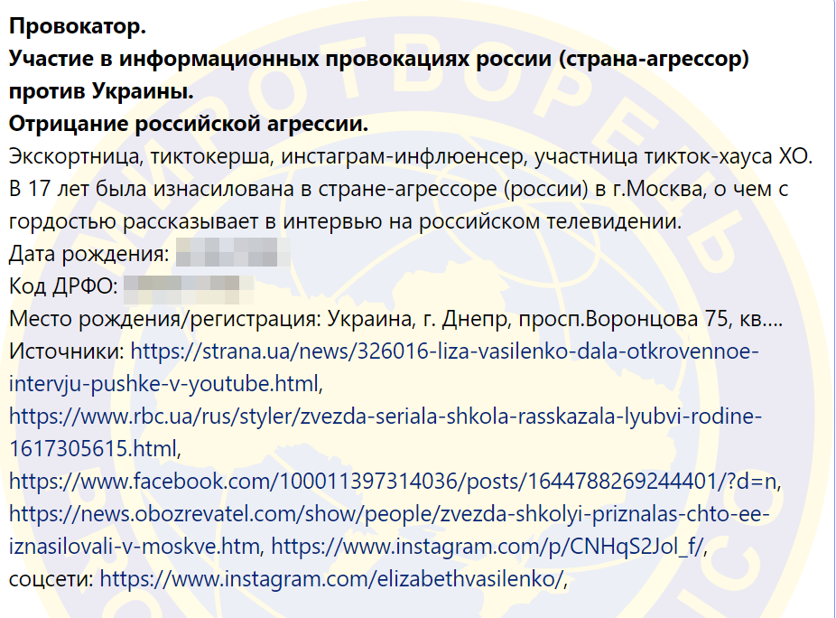 На "Миротворце" написали, что Василенко "экскортница, тиктокерша, инстаграм-инфлюенсер, участница тикток-хауса XO. В 17 лет была изнасилована в стране-агрессоре (России) в г.Москва, о чем с гордостью рассказывает в интервью на российском телевидении".