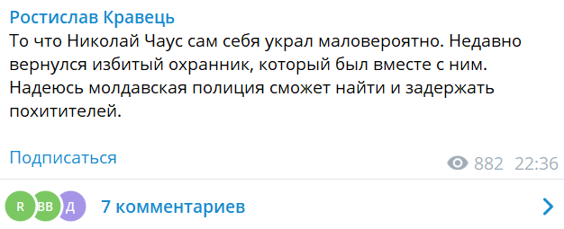 "То, что Николай Чаус сам себя украл маловероятно. Недавно вернулся избитый охранник, который был вместе с ним. Надеюсь, молдавская полиция сможет найти и задержать похитителей (Николая Чауса - Ред.)", - написал адвокат.