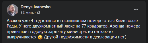 В декларации за 2020 год глава МВД указал аренду номера в гостинице "Киев" общей площадью 77,6 м2. Согласно информации на сайте гостиницы, номера такого размера стоят от 3 754 гривен за сутки. То есть за год Арсен Аваков тратит около 1 351 440 гривен на аренду жилья в столице.