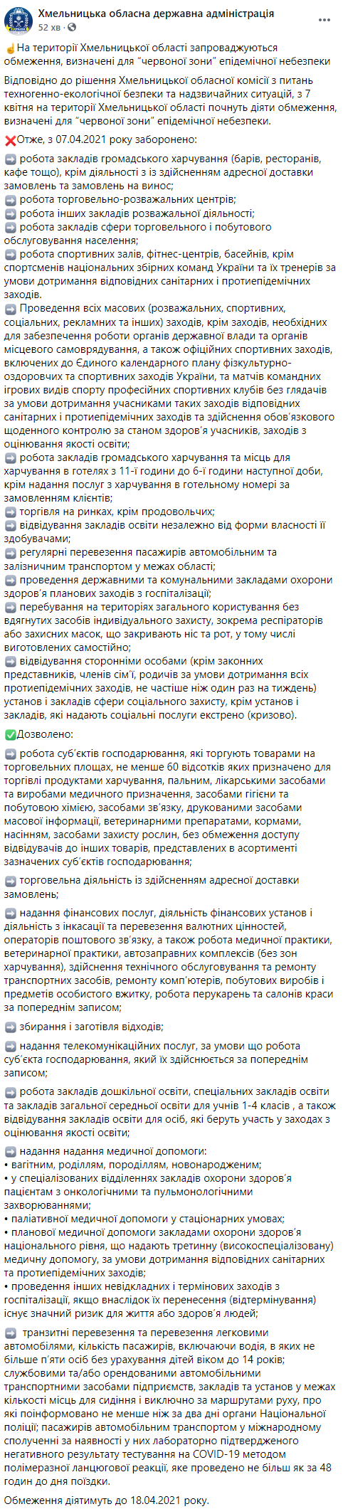 На территории "оранжевой" Хмельницкой области с 7 по 18 апреля будут действовать ограничения "красной" зоны карантина. В частности, со среды запрещается работа ресторанов, спортзалов, а также проведения массовых мероприятий.
