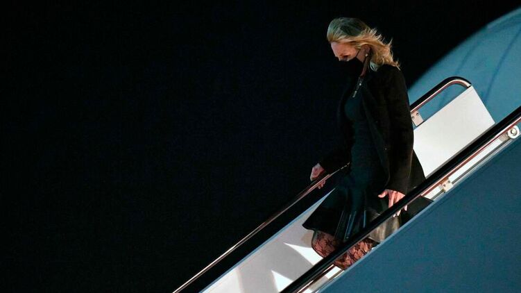 Фотографы запечатлели первую леди в комплекте из черного жакета, платья выше колен темно-бутылочного цвета со вставкой из эко-кожи на подоле, ботильонов на довольно высоком каблуке и ажурных колготок. В таком виде Джилл прилетела бортом номер один из Калифорнии.