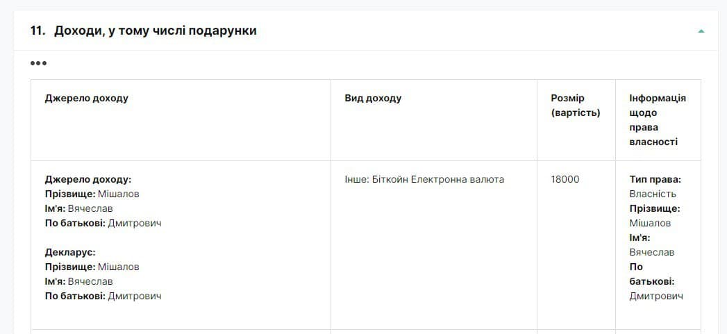 "Больше всего криптовалюты записал в декларации бывший депутат Днепровского городского совета Вячеслав Мишалов – 18 000 биткоинов (в эквиваленте это более чем 1 млрд долларов США). Он возглавляет рейтинг чиновников, которые декларировали биткоины два года подряд", - говорится в сообщении Опендатабот.
