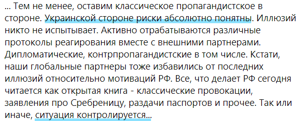 "Украинской стороне риски абсолютно понятны. Иллюзий никто не испытывает. Активно отрабатываются различные протоколы реагирования вместе с внешними партнерами. Дипломатические, контр-пропагандистские, в том числе. Кстати, наши глобальные партнеры тоже избавились от последних иллюзий относительно мотиваций РФ … Так или иначе, ситуация контролируется...", - написал Подоляк на своей странице в Facebook.