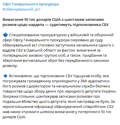В результате Офис генпрокурора открыл уголовное производство и направил в суд обвинительный акт в отношении замначальника одного из отделов СБУ по факту вымогательства по предварительному сговору группой лиц, а также приобретение и хранение огнестрельного оружия без предусмотренного законом разрешения (ч. 2 ст . 189, ч. 1 ст. 263 УК Украины).