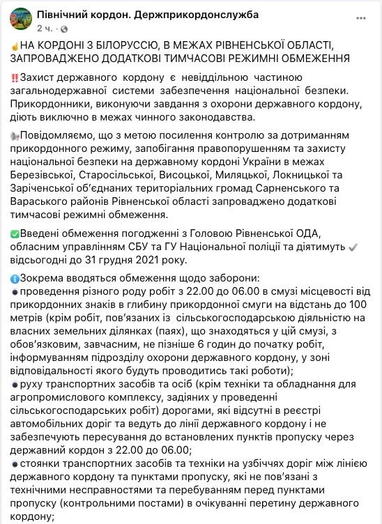 С 12 апреля власти Украины ввели дополнительные ограничения на границе с Беларусью. Они заявляются как временные до 31 декабря 2021 и территориально касаются Ровенской области. Об этом сообщает пресс-служба Северного управления Госпогранслужбы.