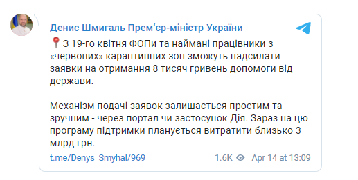 "С 19-го апреля ФОПы и наемные работники из "красных" карантинных зон смогут отправлять заявки на получение 8000 гривен помощи от государства.