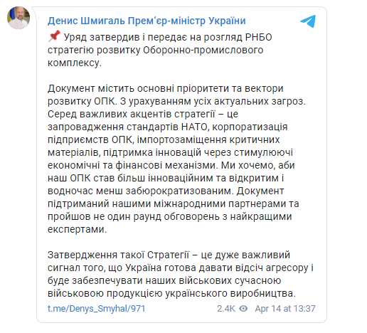 Документ содержит основные приоритеты и векторы развития ОПК с учетом всех актуальных угроз. Об этом в своем телеграм-канале написал премьер-министр Денис Шмыгаль.