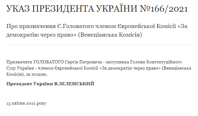 "Назначить Головатого Сергея Петровича - заместителя Председателя Конституционного Суда Украины - членом Европейской Комиссии "За демократию через право" (Венецианская Комиссия), по соглашению.", - говорится в указе.