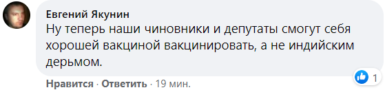 "Ну теперь наши чиновники и депутаты смогут себя хорошей вакциной вакцинировать, а не индийским дерьмом", - делится подозрениями о целевом назначении вакцины пользователь Евгений Якунин.