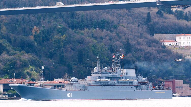 В субботу, 17 апреля в Черное море из Средиземного вошли еще два больших десантных корабля (БДК) Северного флота России - "Александр Отраковский" и "Кондопога", присоединившись к уже находящимся там на учениях 15 судам.