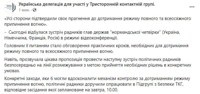 Украинская делегации в ТКГ выпустила релиз, в котором сообщила, что все стороны выступили за поддержание перемирия. Также сообщается об идее провести следующую встречу провести на линии разграничения.