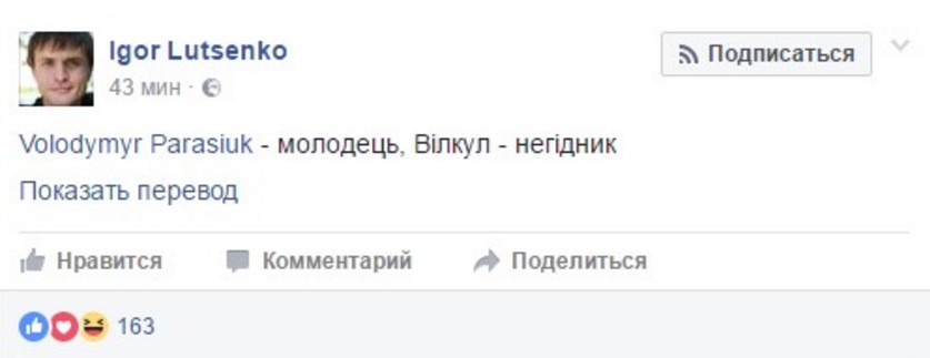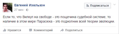 "Если то, что Вилкул на свободе - это пощечина судебной системе, то наличие в этом мире Парасюка - это поджопник всей теории эволюции", - написал Евгений Ихельзон, который, судя по всему, Вилкулу не симпатизирует, но и поведение Парасюка осуждает.
