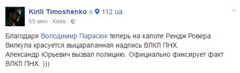 "Благодаря Володимир Парасюк теперь на капоте Рендж Ровера Вилкула красуется выцарапанная надпись ВЛКЛ ПНХ. Александр Юрьевич вызвал полицию. Официально фиксирует факт ВЛКЛ ПНХ. )))" - шутит пользователь Кирилл Тимошенко на своей странице в Facebook.