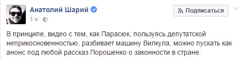 "В принципе, видео с тем, как Парасюк, пользуясь депутатской неприкосновенностью, разбивает машину Вилкула, можно пускать как анонс под любой рассказ Порошенко о законности в стране", - пишет на своей странице в соцсети Facebook блогер Анатолий Шарий.