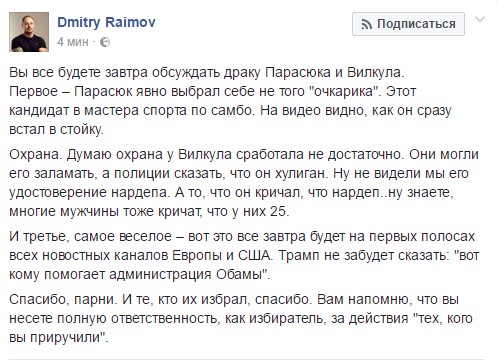 "Вы все будете завтра обсуждать драку Парасюка и Вилкула. Первое – Парасюк явно выбрал себе не того "очкарика". Этот кандидат в мастера спорта по самбо. На видео видно, как он сразу встал в стойку. Охрана. Думаю охрана у Вилкула сработала не достаточно. Они могли его заламать, а полиции сказать, что он хулиган. Ну не видели мы его удостоверение нардепа. А то, что он кричал, что нардеп..ну знаете, многие мужчины тоже кричат, что у них 25. И третье, самое веселое – вот это все завтра будет на первых полосах всех новостных каналов Европы и США. Трамп не забудет сказать: "вот кому помогает администрация Обамы". Спасибо, парни. И те, кто их избрал, спасибо. Вам напомню, что вы несете полную ответственность, как избиратель, за действия "тех, кого вы приручили"", - пишет Дмитрий Раимов на своей странице в Facebook.