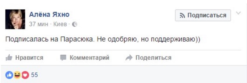 "Подписалась на Парасюка. Не одобряю, но поддерживаю))", - пишет в Facebook журналист Алёна Яхно.