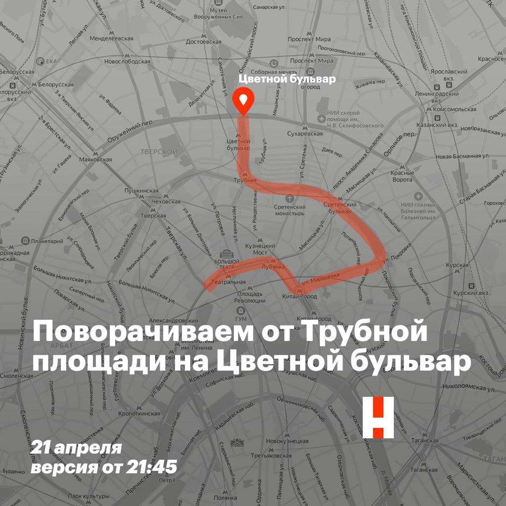 21:48 Дорога от Трубной на Пушкинскую перекрыта. Сторонников Навального зовут на Цветной бульвар.