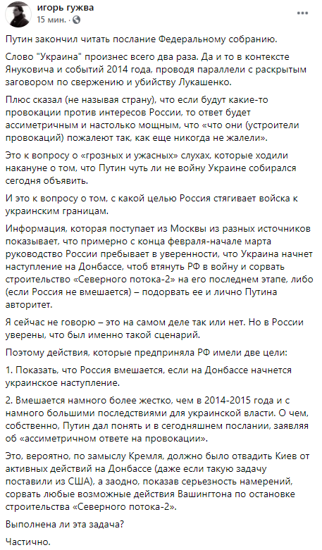 2. Вмешается намного более жестко, чем в 2014-2015 годах, и с намного большими последствиями для украинской власти. О чем, собственно, Путин дал понять и в сегодняшнем послании, заявляя об "ассиметричном ответе на провокации".