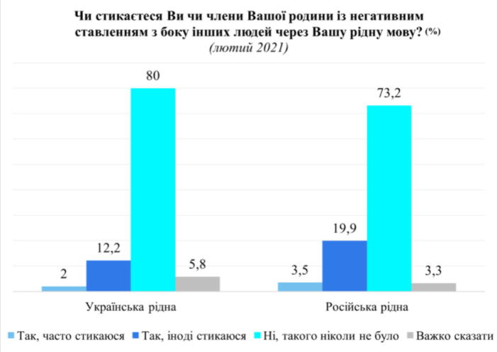 По данным опроса, около 16% граждан утверждают, что они или члены их семей сталкивались с негативным отношением со стороны других людей из-за их родного языка. Среди тех, кто считает родным украинский язык, о случаях негативного отношения сказали 12%, а среди тех, кто считает родным русский язык - 20%.