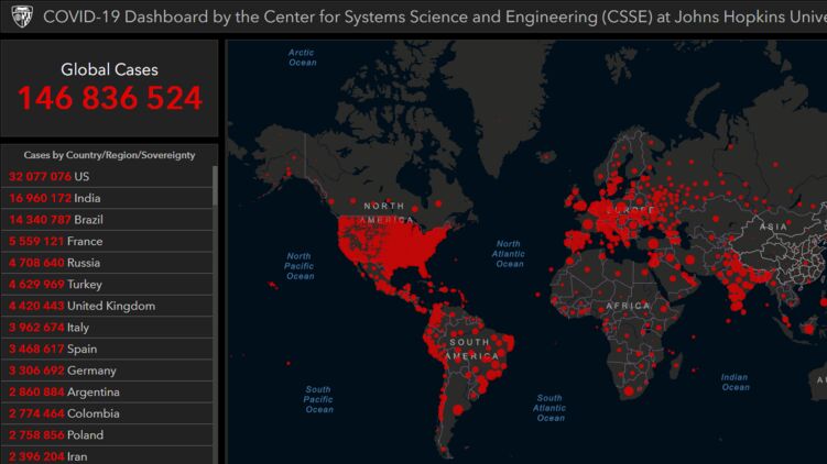 По данным на 26 апреля, число зараженных на Земле приближается уже к 147 миллионам, фото: университет Дж. Хопкинса
