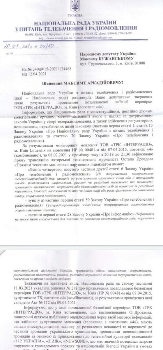 "Высказывания Дроздова... имеют признаки опосредованного призыва к разжиганию ненависти и вражды к части граждан украинского общества, пропаганды неполноценности граждан по признаку их принадлежности к телевизионной аудитории телеканалов "112 Украина", ZIK, NewsOne, что имеет значительный потенциал угрозы нарушения общественного порядка и национальной безопасности Украины в условиях агрессии Российской Федерации против Украины", – значится в выводах Нацсовета.