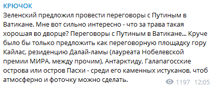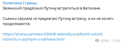 Телеграм-канал "Политика Страны" сравнил очередное предложение о встрече в Ватикане со съемками сериала под названием "я предлагаю Путину встречу, а он не хочет". (Напомним, первым от Зеленского поступило предложение встретиться с Путиным "в любой точке украинского Донбасса, где идет война", - Ред).