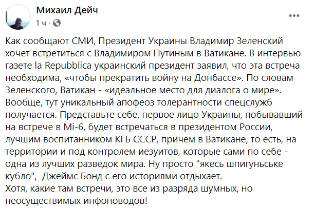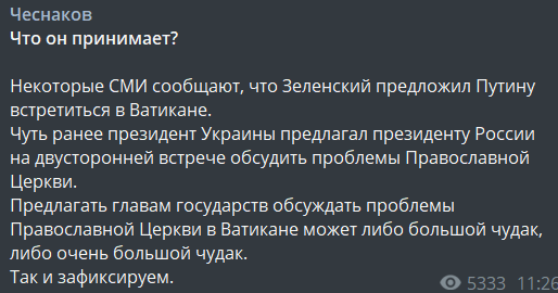 "Некоторые СМИ сообщают, что Зеленский предложил Путину встретиться в Ватикане.