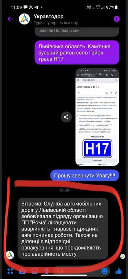 В комментариях у автора фотографий отметили губернатора Львовской области Максима Козицкого и аккаунт областного "Укравтодора". И сегодня чиновники подтвердили, что знали о проблеме до падения моста.