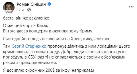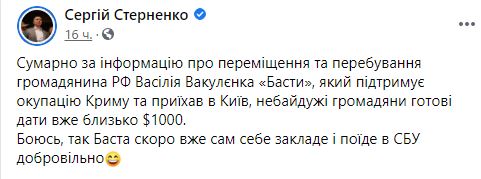 "Суммарно за информацию о перемещении и нахождении гражданина РФ Василия Вакуленко (Басты), который поддерживает оккупацию Крыма и приехал в Киев, неравнодушные граждане готовы дать уже около 1000 долларов. Боюсь, так Баста скоро уже сам себя заложит и поедет в СБУ добровольно", - написал радикал.