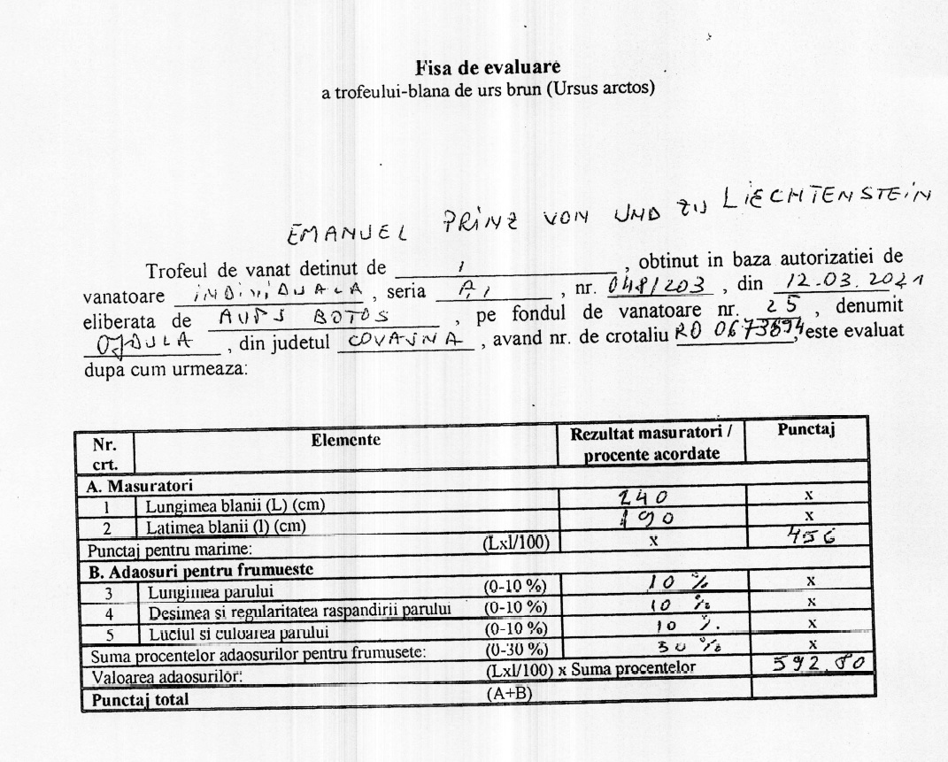 Hумынская неправительственная организация Agent Green и австрийская неправительственная организация VGT утверждают, что медведь был застрелен в марте в заповедной зоне Карпат принцем Эмануэлем фон унд цу Лихтенштейном.