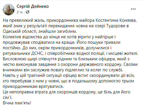 "К большому сожалению, пограничника майора Константина Коняева, который исчез в результате опрокидывания лодки на озере Тудоров в Одесской области, нашли погибшим.