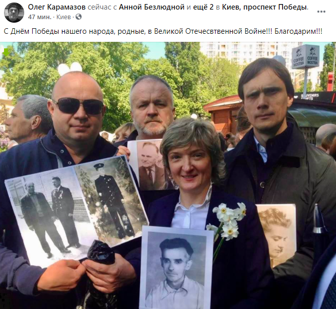 10:11 В Киеве рок-музыкант Олег Карамазов, гендиректор Першого незалежного Егор Бенкендорф, руководитель Inter Media Group Анна Безлюдная и политолог Владимир Грановский вышли с портретами своих воевавших предков.