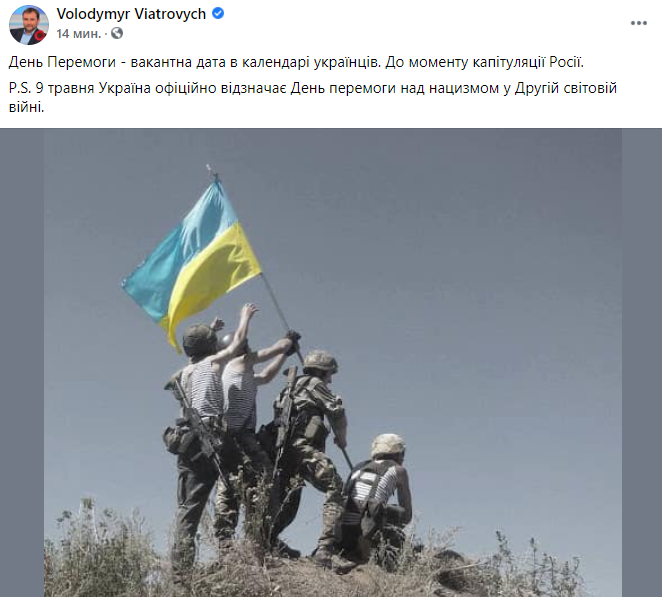 08:23 Нардеп из "Евросолидарности" Владимир Вятрович назвал День Победы "вакантной датой в календаре украинцев до капитуляции России".