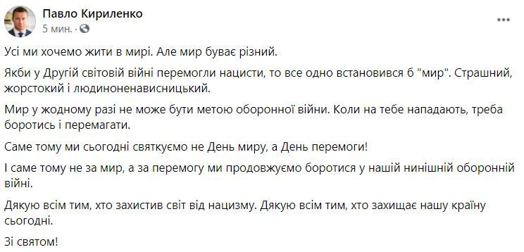 Он говорит, что все народы, без приставки "больше" или "меньше" были важны для победы. И поэтому "мы не позволим минимизировать роль украинцев, которые в составе советской армии и войск союзников Антигитлеровской коалиции" не дали нацистам господствовать.
