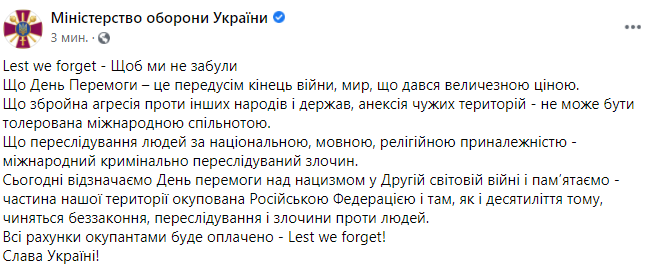 "Часть нашей территории оккупирована Российской Федерацией и там, как и десятилетия назад, совершаются беззакония, преследования и преступления против людей", - пишут украинские военные, видимо, намекая, что и 76 лет назад нас тоже оккупировала Россия.