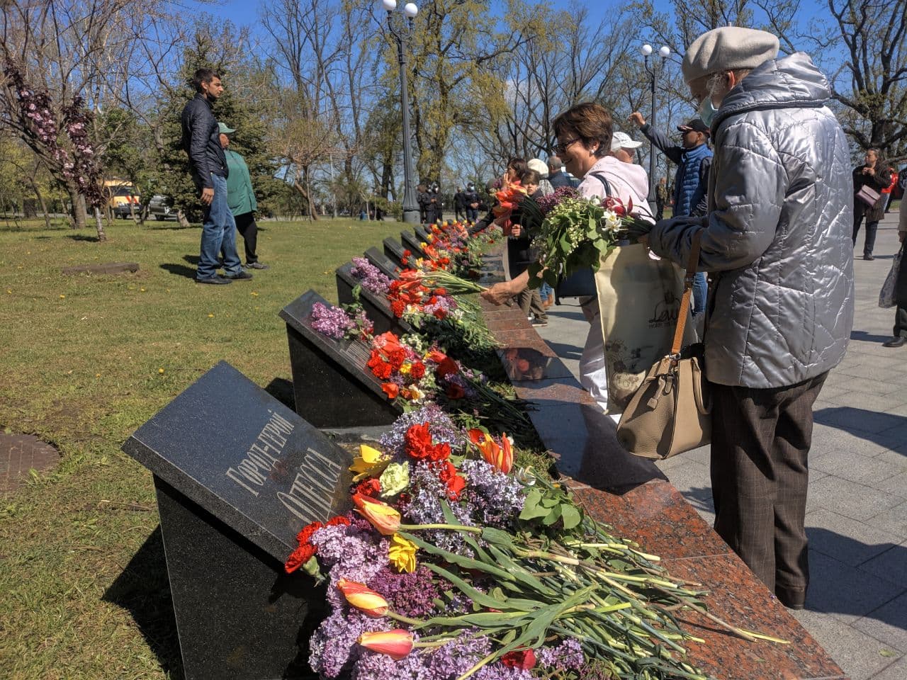10:14 В Одессе на Аллее Неизвестного Матроса уже море цветов. Людей пропускают через рамки металлоискателя. Очень много желающих положить букет к памятнику.