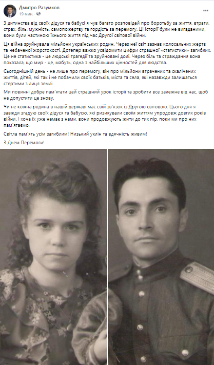 08:25 Спикер парламента Дмитрий Разумков опубликовал воспоминания о своих бабушке и дедушке.