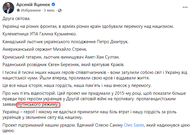 Также, перечисляя украинцев, которые воевали с нацизмом, он на первое место поставил солдат УПА, а также тех, кто служил в армиях США и Канады. Советских воинов, которые внесли главный вклад в победу, он поставил на последнее место.