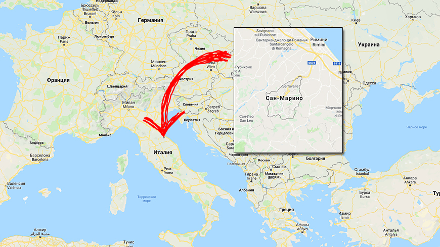 Сан-Марино находится на севере Италии, его площадь 61 кв. км