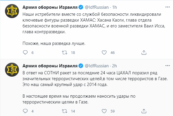 Напомним, что вечером в понедельник, 10 мая, на Ближнем Востоке началась крупнейшая за последние годы эскалация. В ответ на ракетные атаки израильские ВВС поразили 130 палестинских военных целей, ликвидировав 15 членов боевых подразделений контролирующей Газу группировки ХАМАС, а также "Исламского джихада".
