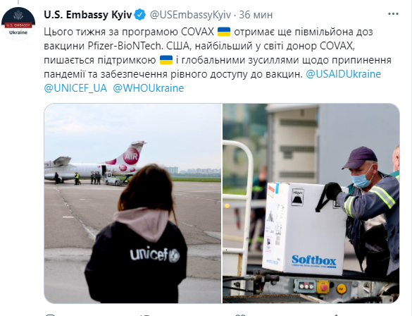 "На этой неделе по программе COVAX Украина получит еще полмиллиона доз вакцины Pfizer-BioNTech. США, крупнейший в мире донор COVAX, гордится поддержкой Украины и глобальными усилиями по прекращению пандемии и обеспечению равного доступа к вакцине", - говорится в сообщении посольства.