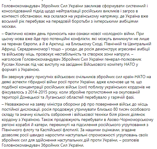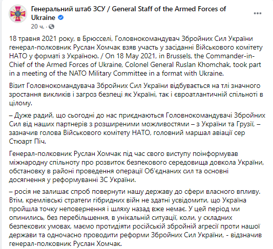Об этом он заявил в ходе заседании Военного комитета НАТО в формате с Украиной, сообщает пресс-служба Генштаба ВСУ на странице в Facebook.