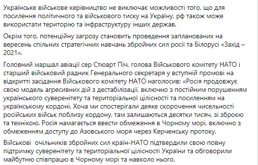 Кроме того, потенциальную угрозу представляет проведение запланированных на сентябрь совместных стратегических учений вооруженных сил России и Беларуси "Запад - 2021".