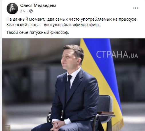 "На данный момент, два самых часто употребляемых на прессухе Зеленского слова - "потужный" и "философия". Такой себе патужный философ".