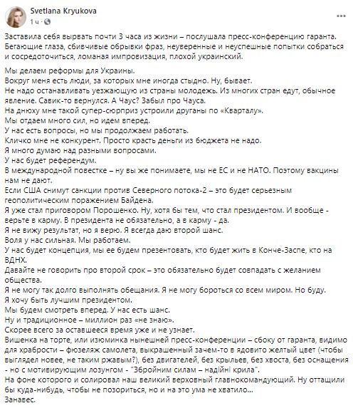 "Заставила себя вырвать почти 3 часа из жизни – послушала пресс-конференцию гаранта.