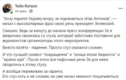 Журналист "Страны" Юлия Корзун, которая была на пресс-конференции, написала, что пока президент пафосно говорил о планах на будущее Украины, в реальном настоящем присутствовавшим предложили сломанный стул.